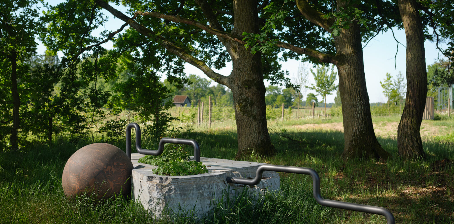 Where Two Gather presents itself as a place where we can meet or where we can retreat for a moment. At the foot of a cluster of mature trees, marble, clay, metal and local plants are brought together in a sculpture that makes us think about what is going on – both visibly and certainly also invisibly – beneath our feet. The irregular line patterns in the stone and clay sharpen our awareness of what has happened at a particular place over a long period of time and whether or not it has left any traces. The local herbs and plants, selected to provide colour or fragrance throughout the seasons, add a physical temporal dimension.