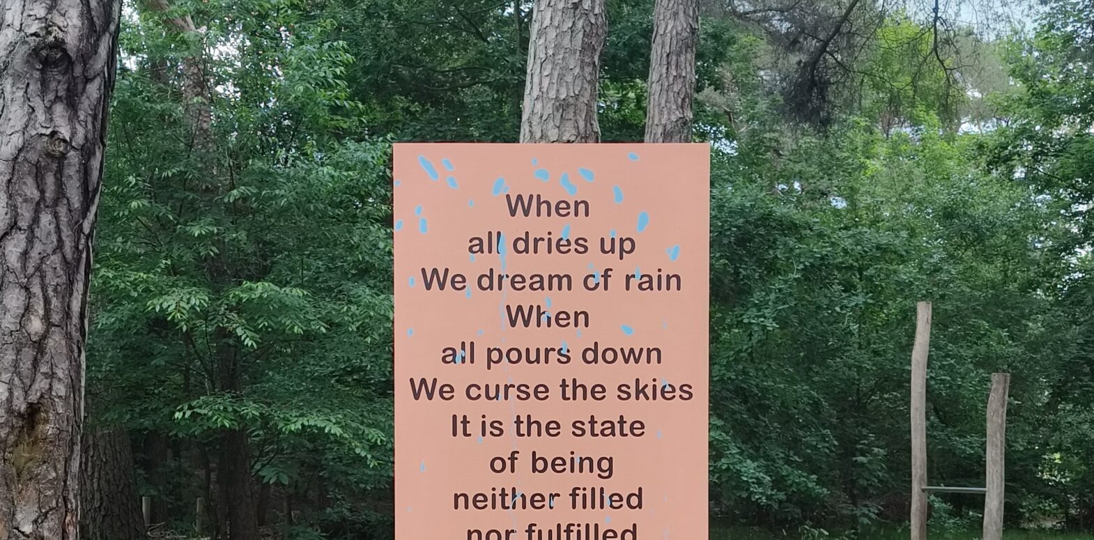 During the first edition of RHIZOMA, Otobong Nkanga presented two new works: the permanent sculptural installation Where Two Gather and the experience-oriented installation Strains and Residues. Along the walking route, Nkanga will also display the poem State of Being – a prelude to the artist book that we are preparing with her and which, for the first time, will include a wide selection of new and existing poems, combined with new graphic works.